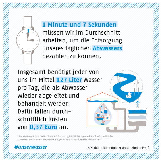 Nicht zu vergessen ist an dieser Stelle: Natürlich fallen bereits für die Gewinnung, Aufbereitung und Verteilung des Wasser – also bevor es zu Abwasser wird – Kosten an. Für diese beträgt die erforderliche Arbeitszeit bereits 1 Minute und 1 Sekunde bis das Wasser als hochwertiges Trinkwasser aus unserem Wasserhahn fließt. Vielleicht kommen Ihnen diese Gedanken in den kommenden Tagen ja in den Hinterkopf, wenn Sie Ihre Arbeit am Morgen beginnen und am Nachmittag beenden – die erste und letzte Minute für #unserwasser.